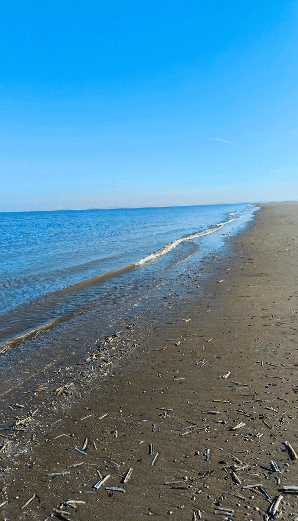 Na de afdaling wandelden we terug richting het park. De zon zakte langzaam, het licht werd zacht en goud. We fantaseerden al over warme chocolademelk met slagroom, zo’n beloning die elke strandwandeling langs zee verdient. Alleen jammer: de strandtenten waren dicht. Geen ramp, want eigenlijk was alles precies goed zo. Zand in je schoenen, haren vol wind, wangen rood.