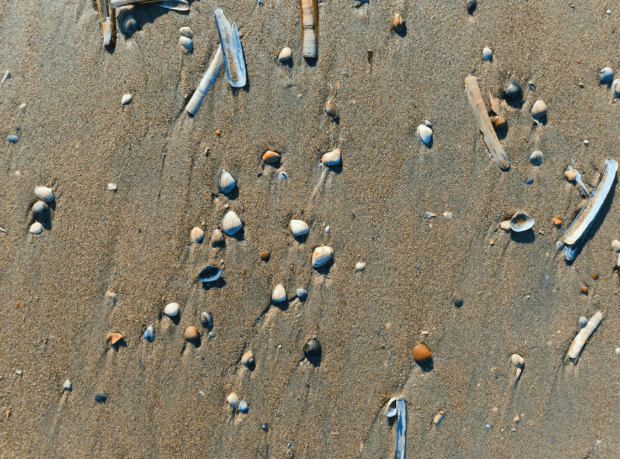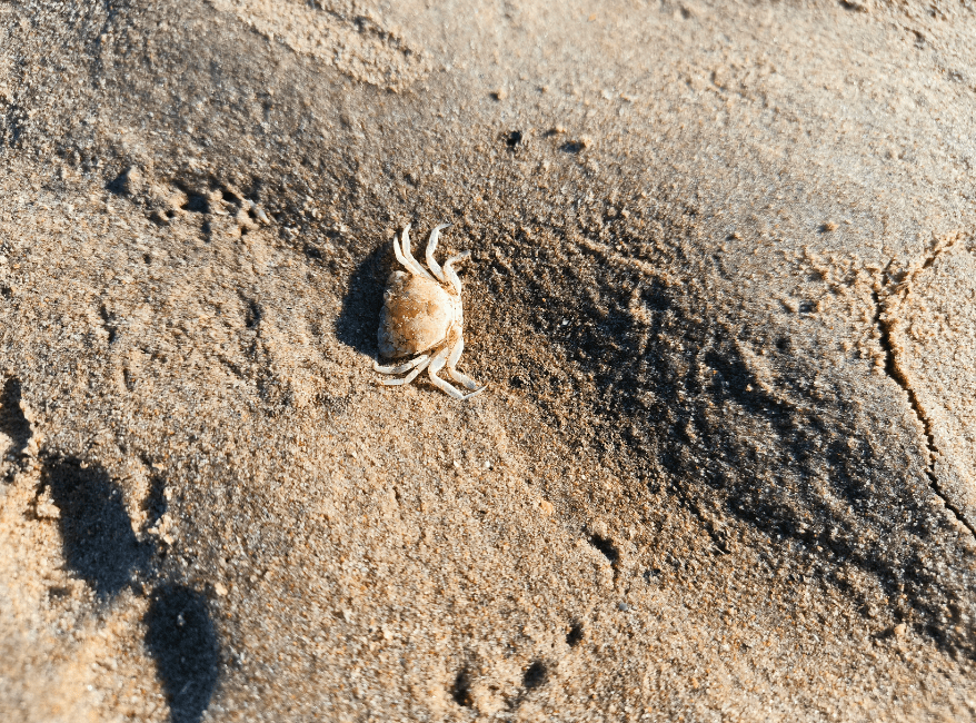 Het was laagwater, of zoals ze dat hier noemen: eb. En niet zomaar een beetje. Voor mijn gevoel liepen we honderden meters extra om bij de zee te komen. Het zand veranderde van rul en licht naar stevig en donker, volgezogen met zeewater. Overal lagen schelpen: kokkels, scheermessen, wulken en een paar krabbetjes die zich gehaast in het zand verstopten zodra we dichterbij kwamen.